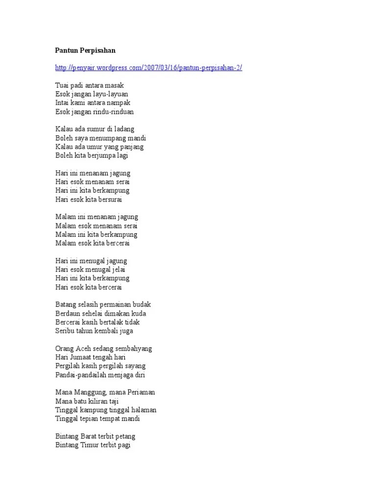 15 rangkap pantun klasik yang bertemakan perpisahan. Tidak kira siapa pun dia. Pantun perpisahan terbaik kenangan memori bersama teman dan kekasih, yang entah bila kan bersua lagi. Ada banyak pantun perpisahan yang penuh makna dan berkesan, yang bisa ungkapkan kepada orang terdekat saat berpisah. Mohon pinjam beberapa rangkap untuk majlis perpisahan guru saya. Telus kata buat anak dara. Teks ucapan majlis persaraan guru besar.